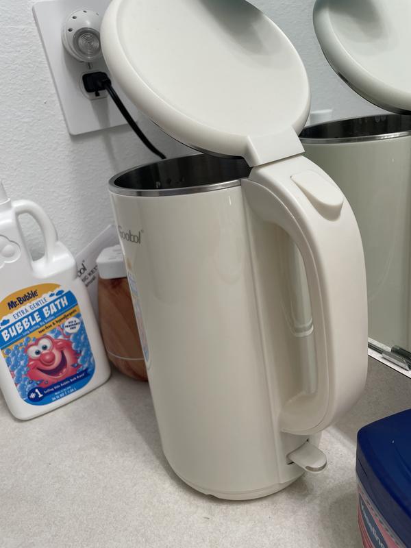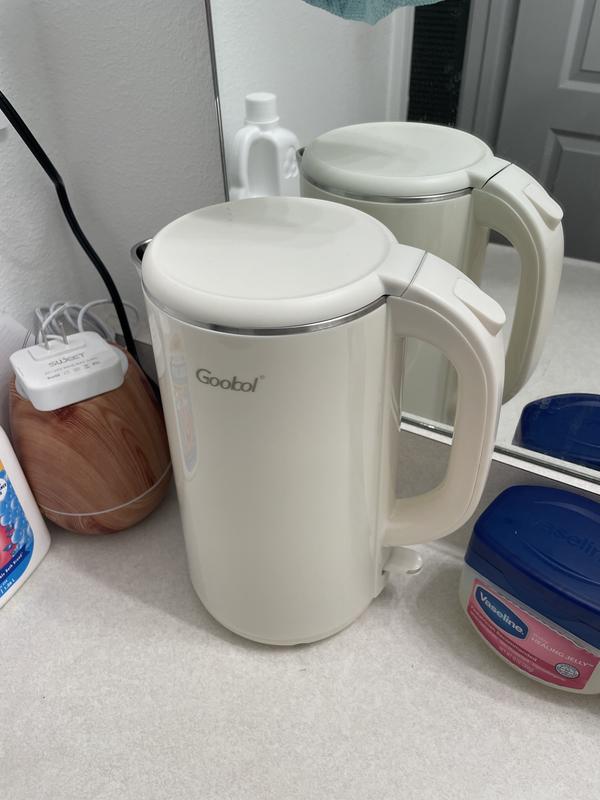 I have a very very fast boiling kettle for my kitchen but I bought this for warming up some water to wet wash cloths with for my boys to wash their faces - their bathroom is way too far from the water heater in the garage and wastes a whole lot of water if i run the tap and wait for the hot water to arrive. This kettle has a larger capacity comparing to other kettles and does not boil too fast to over heat for my usage purpose so this is a perfect kettle for me. I love the clean white look too (see photos)