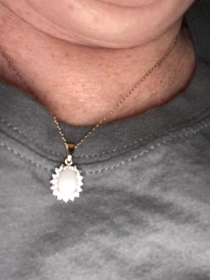 very disappointing necklace. The opal is flat, dull white and is not at all colorful like the picture. I waited too long to return it (it was a Christmas present for my daughter that I bought in Nov) and I'm stuck with it now.