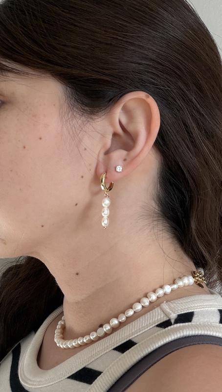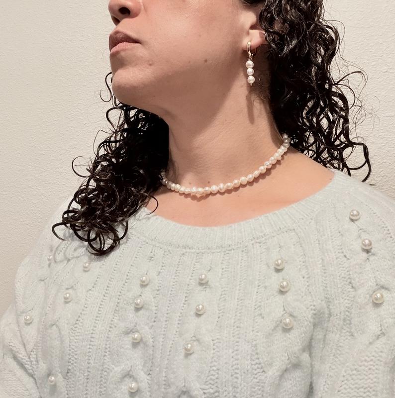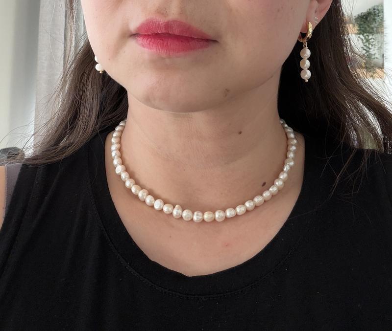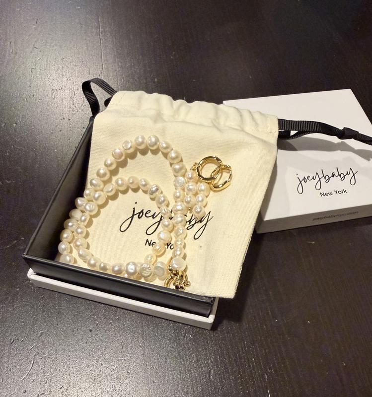 This pearl set is beautiful. The pearls have a gorgeous sheen, and I love that each one has a unique shape, giving the whole set a handcrafted look. The necklace sits at a choker length, is very comfortable, and has a nice weight to it. I also love that the hardware is gold on both the necklace and the earrings. The earrings are lightweight and very easy to close. Overall, this set has a classic look with a modern twist, and it’s incredibly easy to wear with either a casual outfit or a dressier one. Another thing I appreciated was the packaging. It comes beautifully presented in a box with a black bow, and inside there’s a soft drawstring bag. Overall, I love this set—from the packaging to the actual product. It’s perfect for gifting.