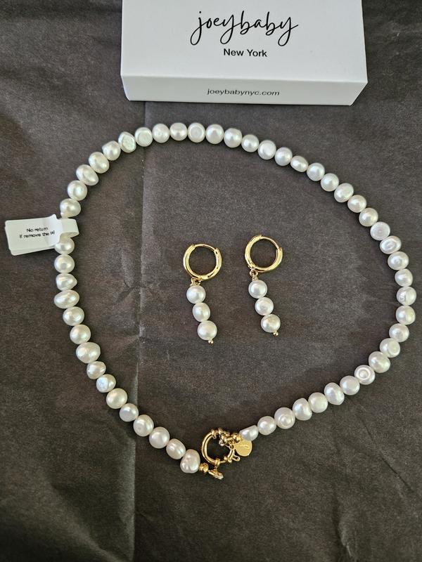 I recently got the Jackie Necklace & Earrings Set from Joey Baby, and I couldn’t be happier. The freshwater pearls are beautifully lustrous and It strikes the perfect balance between elegant and versatile. The earrings are lightweight and comfortable for my sensitive ears. The craftsmanship feels solid. What i really like about the necklace is its clasp, its pretty big and very easy to wear and remove. The gift-wrapped packaging and handwrite note added a very nice touch.