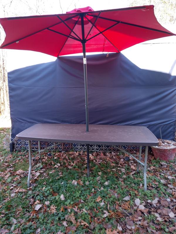 Needed an outdoor table big enough for family gatherings or just to use as a table go use when grilling etc and I'm very pleased with this one! Great size, has center hole for umbrella with a cap to cover when not using, legs fold out and snap lock easily, has a wicked type look and overall very sturdy! It's been through a couple of heavy storms and high winds and it never budged do it seems to be fairly weighted. I absolutely love it!