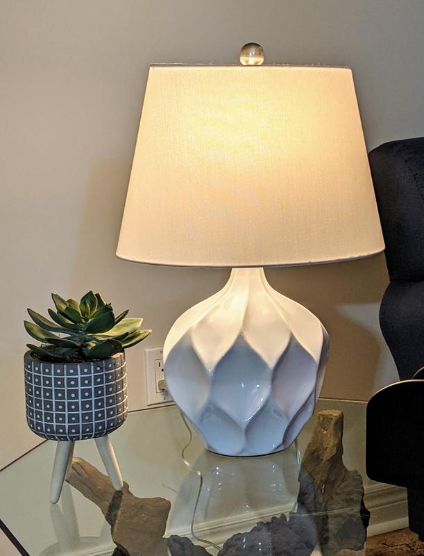 Good lamp for console/sofa tables or any space that doesn't accommodate a larger round shape . The white base and shade contrast nicely against colored walls. Versatile and attractive.