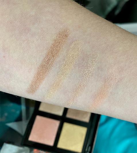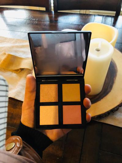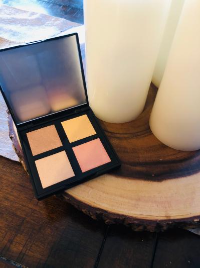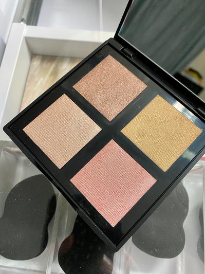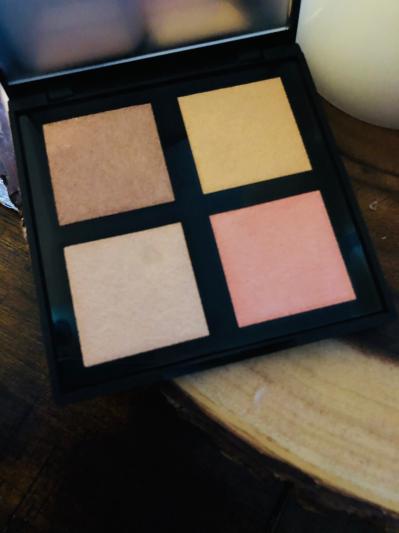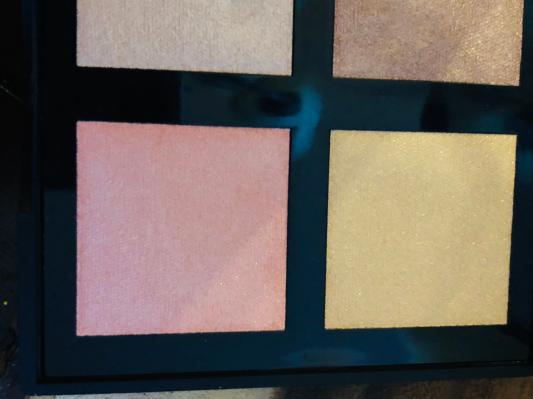 This is a really nice highlighter. It has a lot of sparkle and shine and the powder consistency is smooth. The payout once the highlighter hits the skin is nice. It looks flawless when applied. I loved how the palette had four color combinations. The darker one is a nice high shine bronzer. The pink and the gold were my favorite. I would continue to use this product.