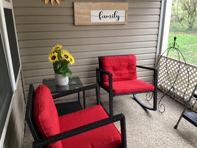 This set fits beautifully on our enclosed patio, it was simple to build and, most important to me, it’s SO comfortable. Couldn’t ask for more…but!…it looks good, too