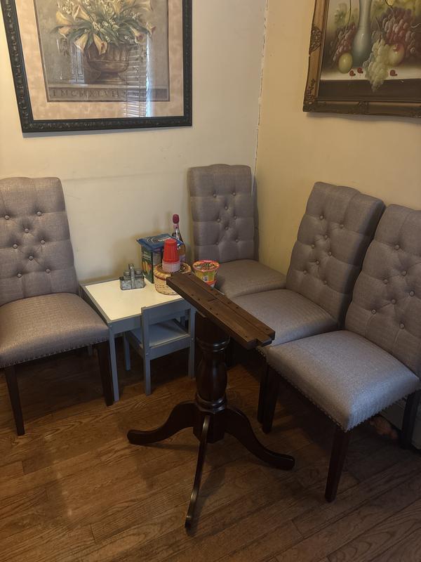 5 Piece Dining Set Includes 1 Drop Leaves Wooden Table and 4 Dark Khaki Linen Fabric Parsons Chair Button Tufted Back with Nail Heads