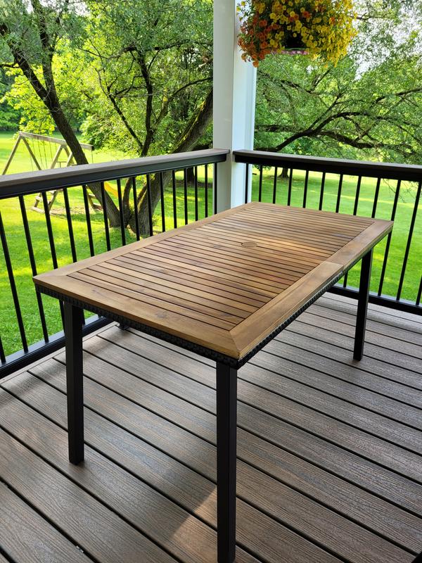 Acacia Wood Table: The table has a hard-wood tabletop, which is naturally massive and reliable for daily use. Braced by a powder-coated steel frame, it is stable and rust-free to endure harsh outdoor environments.