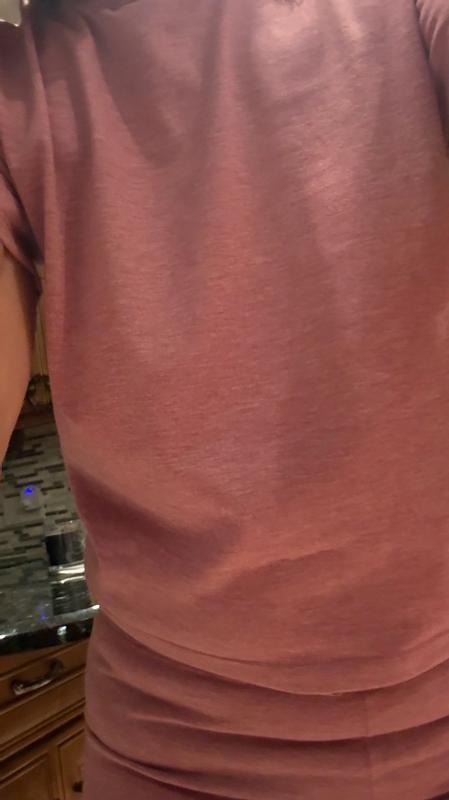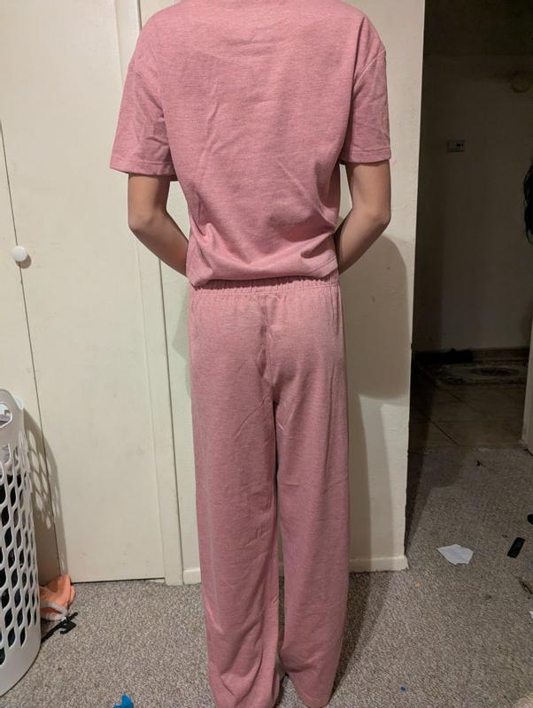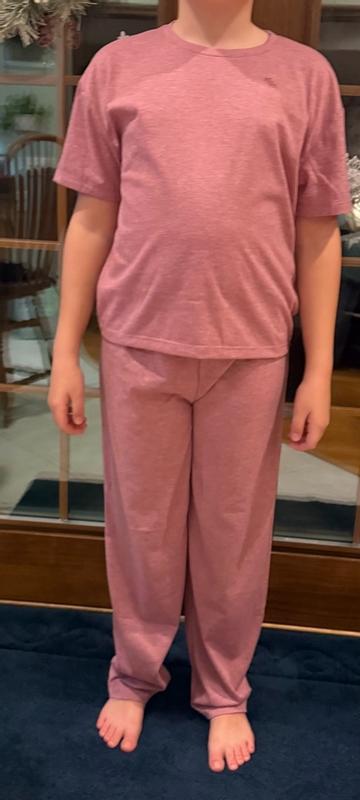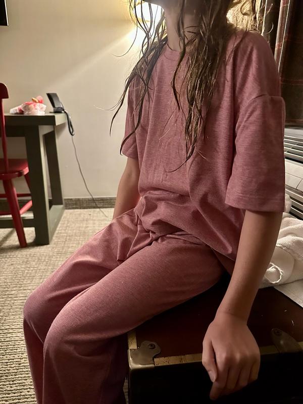 We have two dislikes: 1-the shirt is a bit short. If she moves her arms or sits down the hem rises. This is for a 12yo who is about 5 feet tall. 2-after a few days she told me the label gets sweaty (it's vinyl). Besides those points, this is a really nice set. The pants are a perfect fit. The material is a sturdy knit, similar to a good t-shirt. It holds shape well and isn't see through. The color is a pleasant dusky rose pink. My daughter is very happy with this set, but if our two issues were resolved it would be perfect.