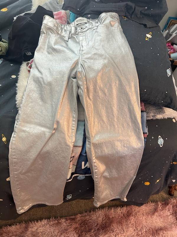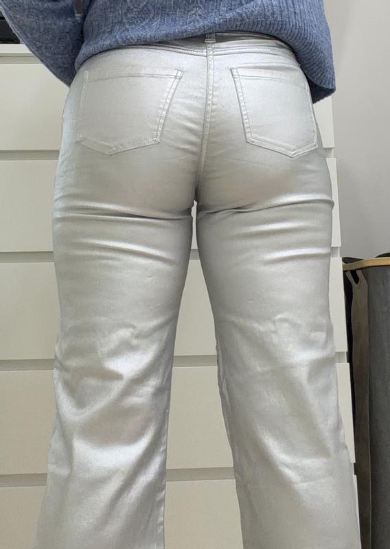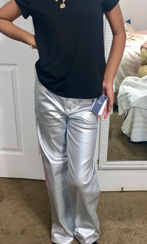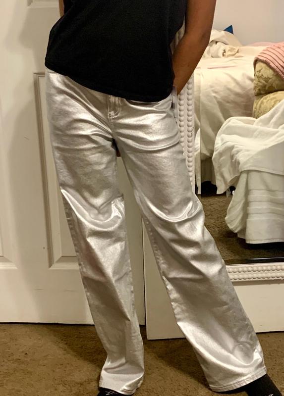 have a beautiful metallic finish that definitely stands out and looks stylish for a night out. The fabric seems structured but not too stiff, and they give a smooth, sleek look overall. The fit around the waist and hips appears flattering, though the material does show creases easily, which might be a downside if you prefer a perfectly smooth look. Overall, they’re trendy, eye-catching, and great if you want something different from classic denim.