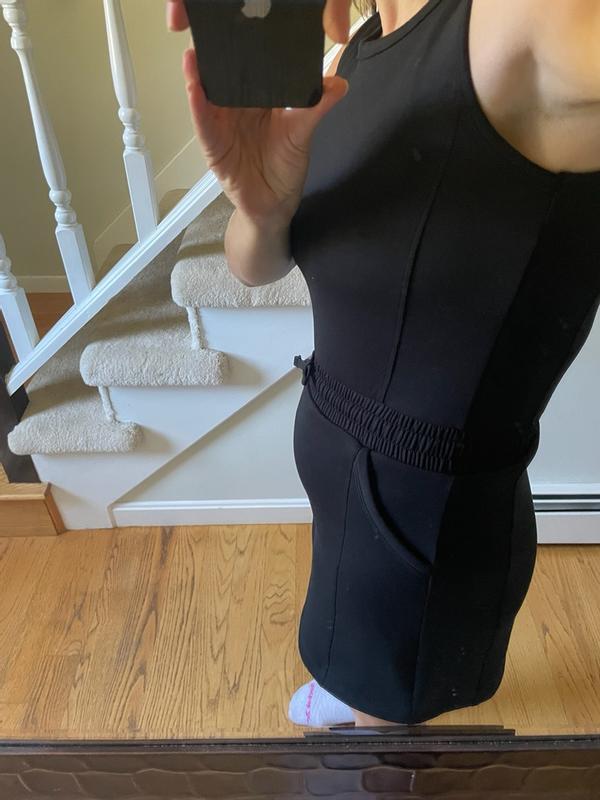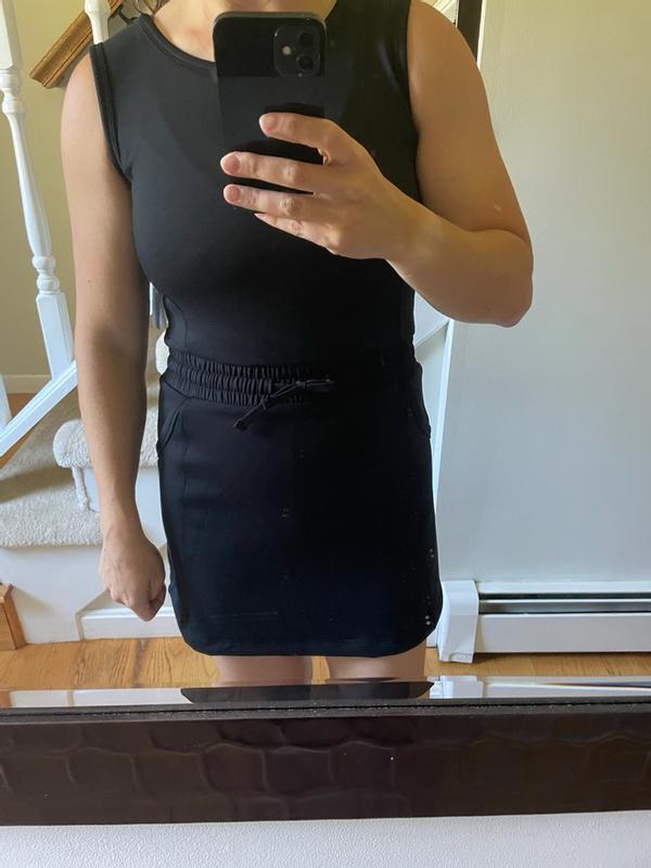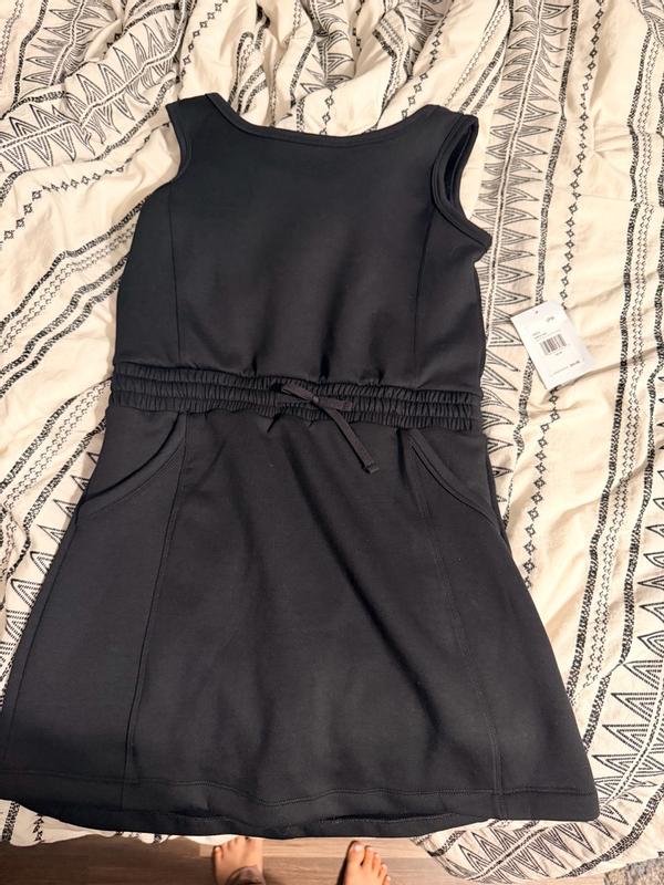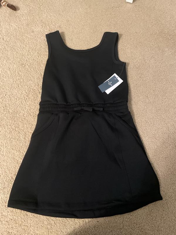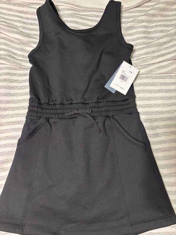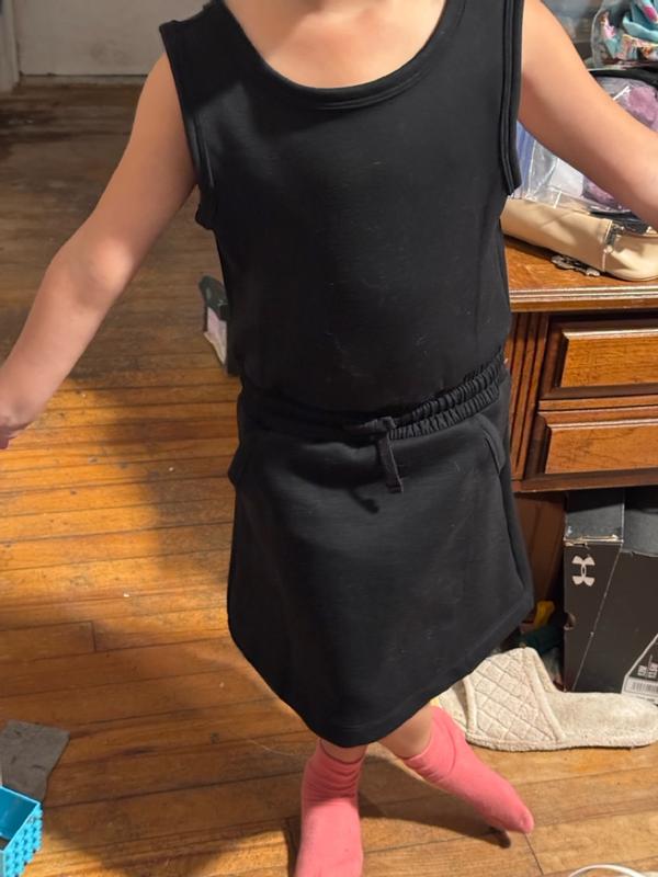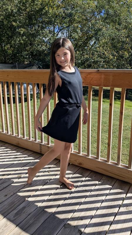 This dress is so cute and comfortable. It has built-in shorts which I love and an elasticized waistband for a perfect fit. The fabric is thick but moisture wicking so it will not make you hot. It's the perfect length too. My daughter loves it.