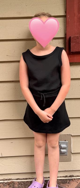 This dress is so cute and comfortable. It has built-in shorts which I love and an elasticized waistband for a perfect fit. The fabric is thick but moisture wicking so it will not make you hot. It's the perfect length too. My daughter loves it.