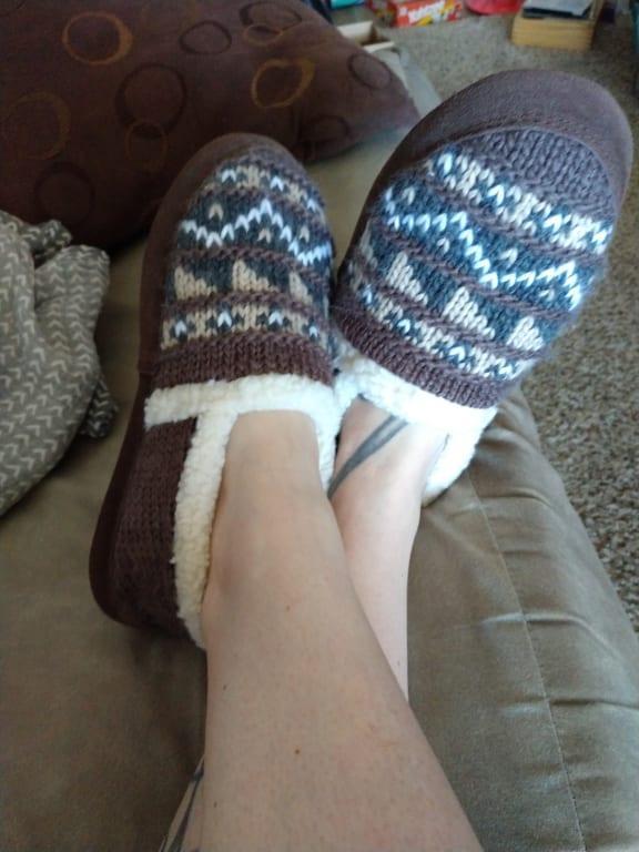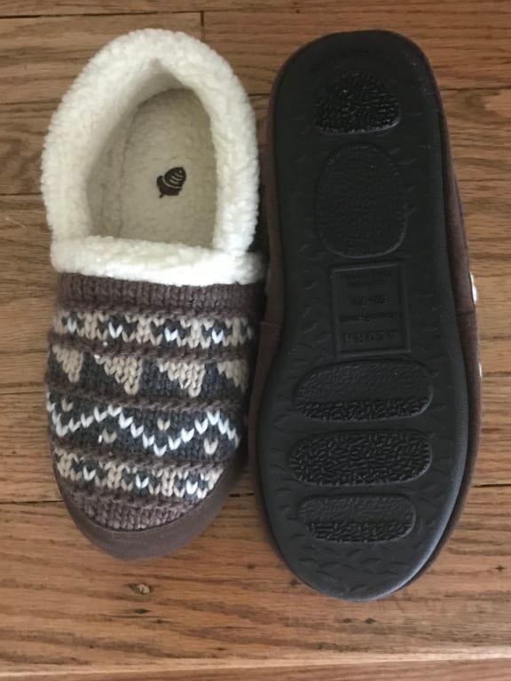 Acorn slippers are the best and the only one I choose to wear. They are warm with fleece lining and comfortable. The plastic sole is great for running out for the paper in the morning. I think the tan and light blue styling looks great too.