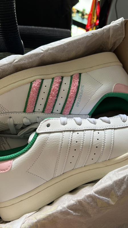 Pink is a lot more vibrant than pictured definitely more neon pink which I love love love , superstars are my fave and I have 8 pairs in different colours