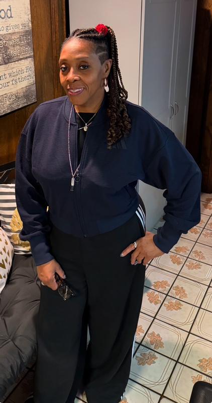 Designed to keep up with your busy pace, this adidas track jacket pairs effortlessly with all types of casual outfits, from gym gear to jeans. The soft, lightweight fabric is cut for a loose fit that allows for layering. Thumbholes secure the sleeves while helping you stay warm as you power through your routine.