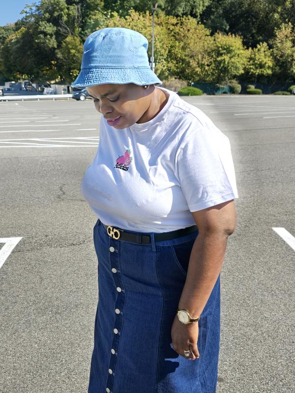 Cute strawberry detail! Average fit of a t-shirt. I do wish the logo on the back was the Trefoil, in my opinion it would go better with the vintage looking strawberries.