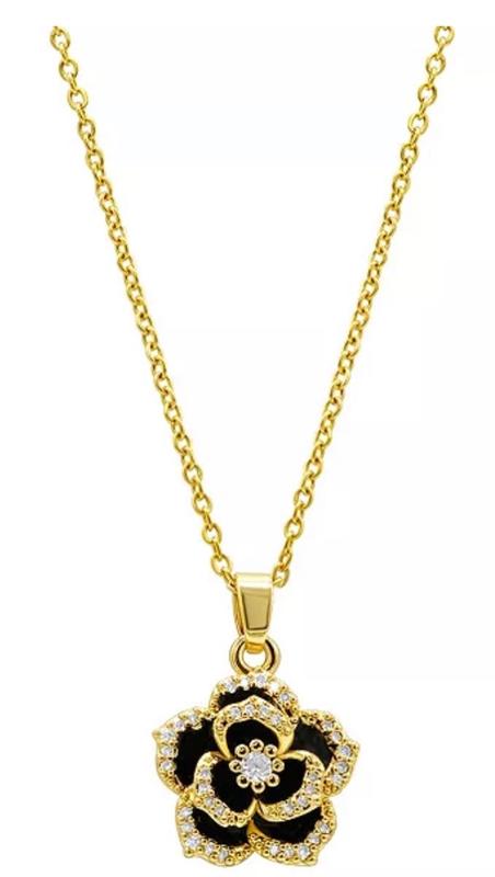 I am in love with this piece I received. I’m a very “black” kind of person and this is so beautiful. The little diamonds shine around through the gold and I love the inner black detail of the flower. The chain is not thin and cheap. Shipping/ packaging was secure and nicely handled