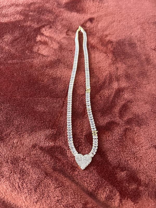 17.5" Baguette Tennis Necklace 14K Gold Plated with Pave Heart Pendant
