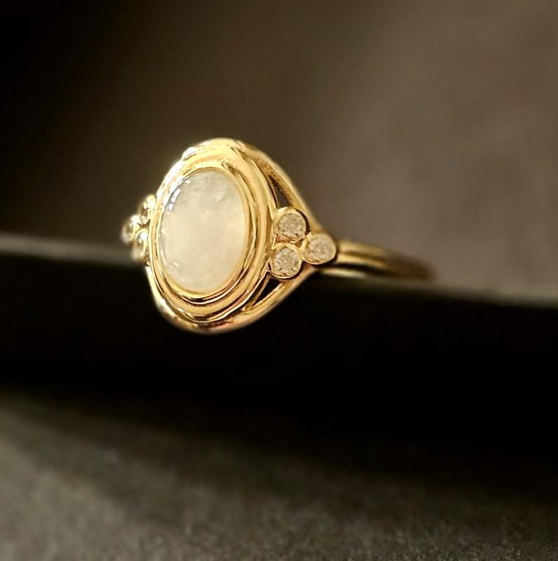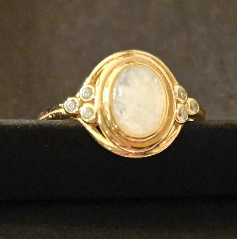 I love this ring! I saw another reviewer say it "looked cheap" but I thought just the opposite. It looks like a piece of very fine jewelry... but also fine jewelry you'd find at an estate sale. Vintage, yet modern looking... if that makes sense. The moonstone is very pretty, the gold vermeil is shiny and flawless, the weight of it is solid... I'm extremely happy with my purchase!