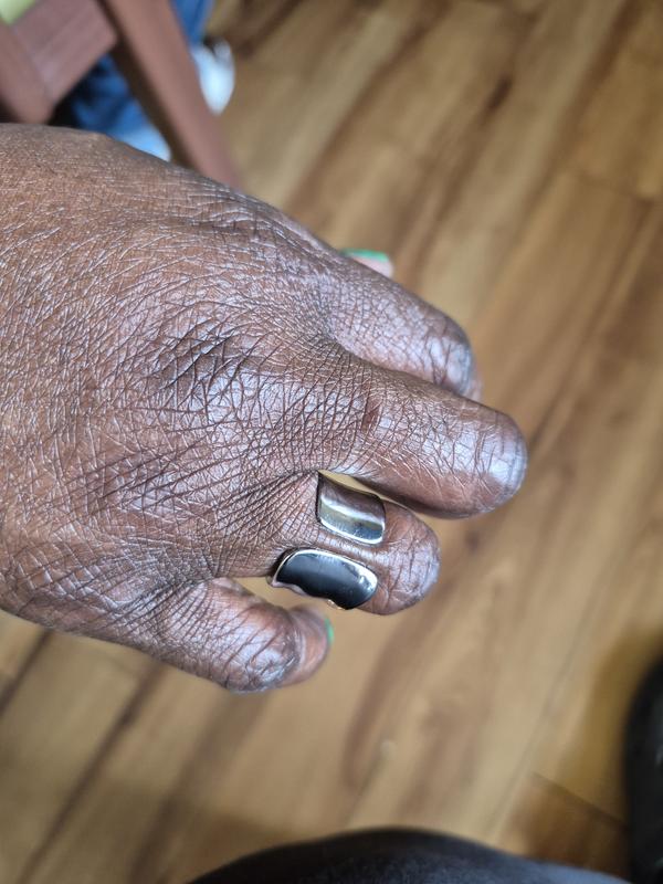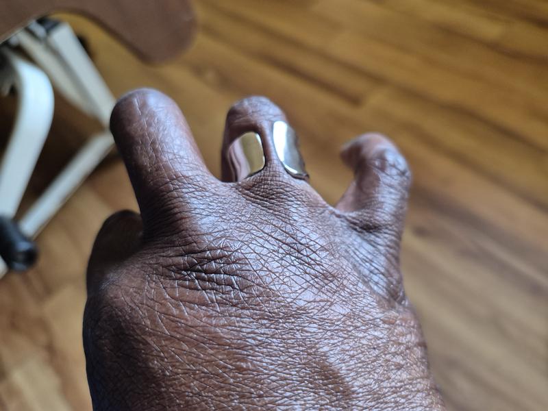I wasn’t sure what to expect based on some reviews of the brand but it’s very comfortable and better looking in person as it’s a tough one to photograph. I needed a new thumb ring , and it’s perfect for this purpose!!! I wear a size 5.5 on my ring finger and the 8 is an exact fit, and goes over the knuckle with ease. .