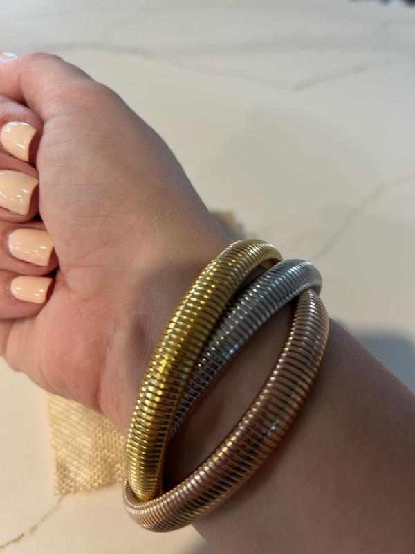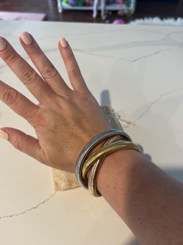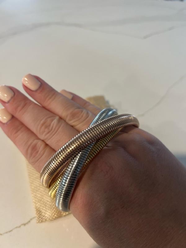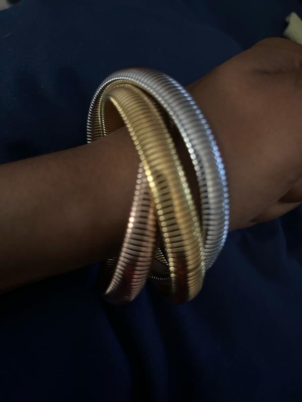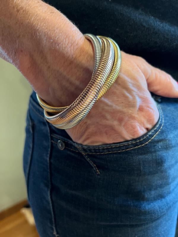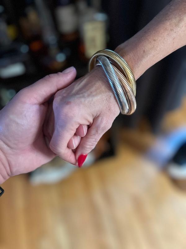 Absolutely love this bracelet! I have larger hands and typically have difficulty getting bracelets over my hand but this one has just enough give. Love the tri tone and received so many compliments on it!