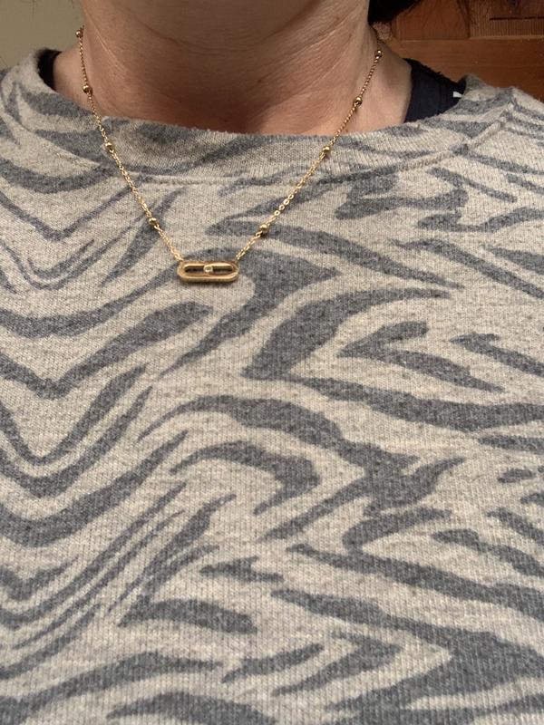 This necklace arrived today, and it is beautiful. Looks expensive. I will get lots of use out of it. Many outfits will look stunning with this minimal bar necklace. Thanks Macy’s!! Please refer to my photo to see how it looks.