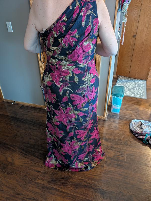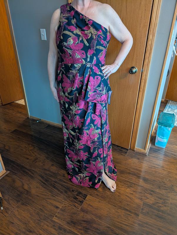 Plus Size Metallic Jacquard One-Shoulder Long Dress