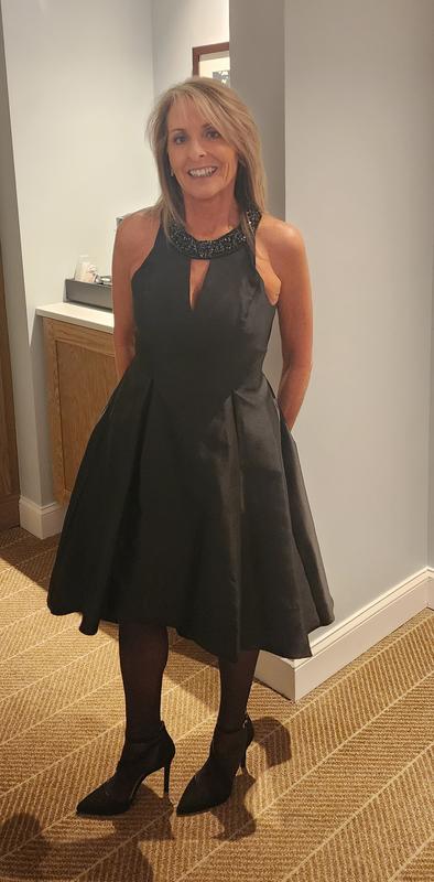 Wore this dress to my son’s wedding. It fit perfectly. The size is true. The best feature is pockets. I was able to keep my phone with me to take pictures. The high jeweled neck made the dress glamorous.