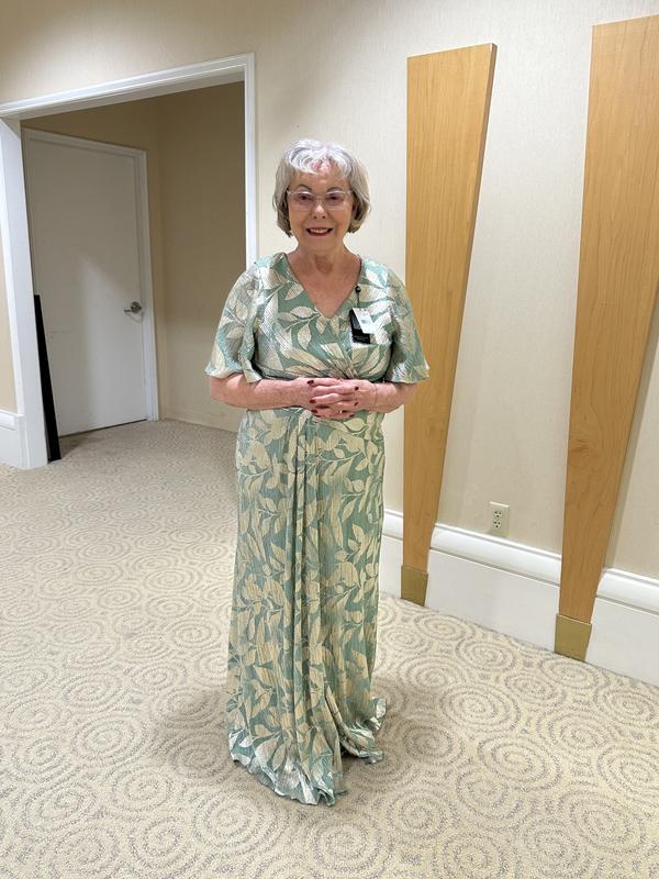 This is a nice dress in beautiful fabric. However the slit up the front causes the skirt to open completely when seated. That is way too much exposure for 80 year old me!!