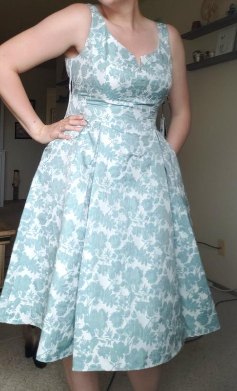 The pattern is more gorgeous in person. The color pops and the dress itself is pretty comfortable. Important: Pay attention to the size chart. I went up a size due to the bust measurements. There is no stretch at all and the rib area is a little tight so that's what you should base your size on. I also love that there is a liner in the skirt. I returned a dress from another store due to it being see-thru so this dress is a big iimprovement. Super excited to wear this to my friend's engagement party!