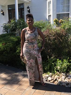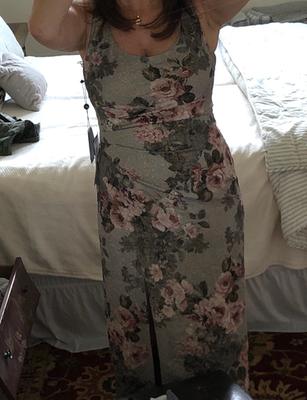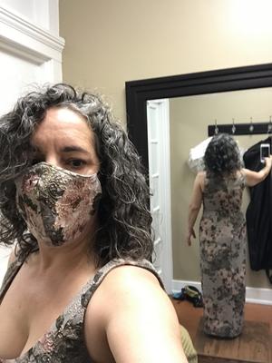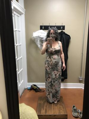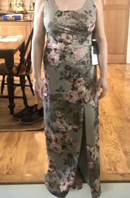 Not having the body of a 5’10”, size 4 model, dress shopping is never fun, but this dress really came through. I added the pink scarf by tacking it to the back straps of the dress. It added some camouflage. There is also a nice amount of give to the material. I lost 25 pounds and was able to wear the dress again with minimal alterations to the shoulders. As everyone has commented in their reviews, the dress is a sage color with a golden sheen that looks tasteful, not cheap. I’m 5’6, and the dress was a bit long with 3” heels. I may have this dress cut down when the next black tie wedding is over. I see they created another version in a cocktail length in a blush color! Beautiful!