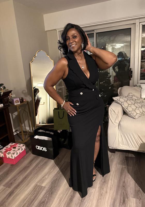 Received many compliments in this dress. I love v-neck dresses. The material is a great weight. The pearl button add luxury to dress. Covered up my 60 year old belly nicely. Wore to nieces black tie optional wedding. Very happy with gown and highly recommend.