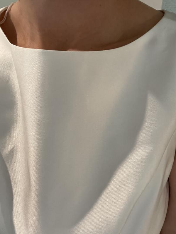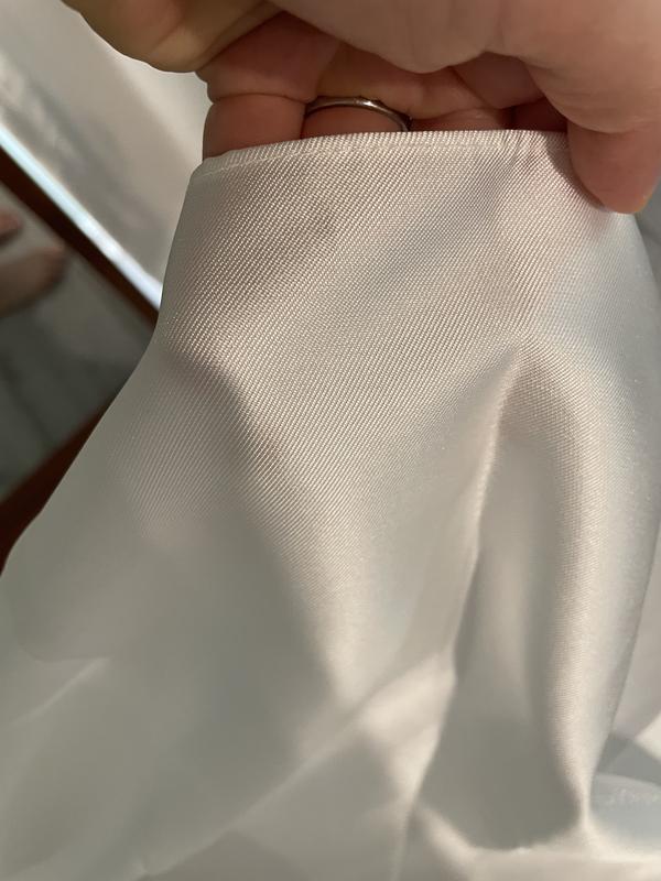 The fabric at the top bends a little in the front of the dress but aside from that I absolutely adored it! It wasn't too tight at the top and the fabric was thick but not too heavy. It is a white dress with some shimmer to it. For reference, I bought the size 10 dress and I'm 5'3 and 150 lbs.