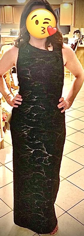 This dress was perfect. I wore it to a black tie wedding and received compliments all night long. I purchased a size 14 and I am 5’9 and 175lbs. It fit me like a glove but the material wasn’t restrictive at all. It moved with me and I loved the golden branchlike pattern under the dark blue.