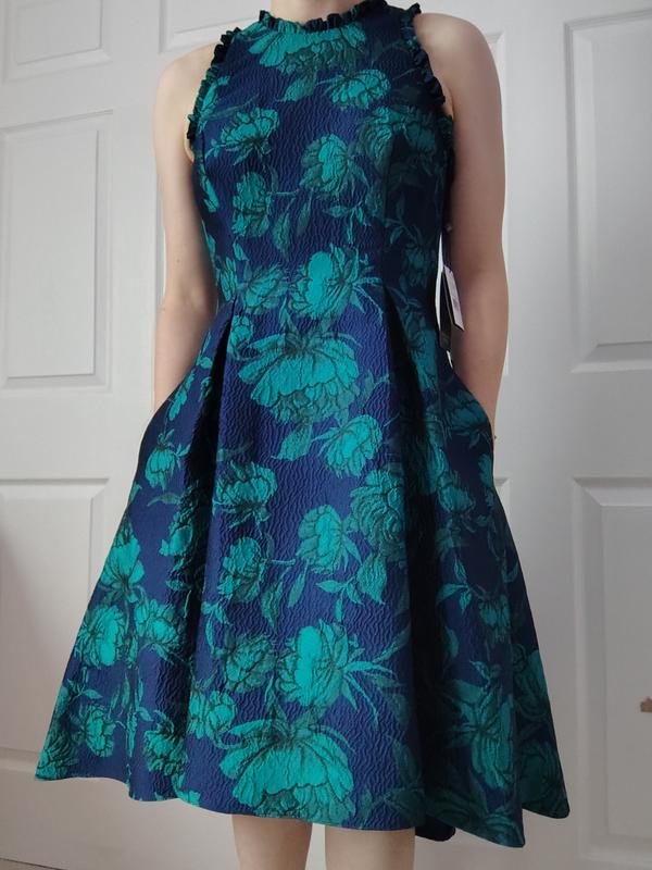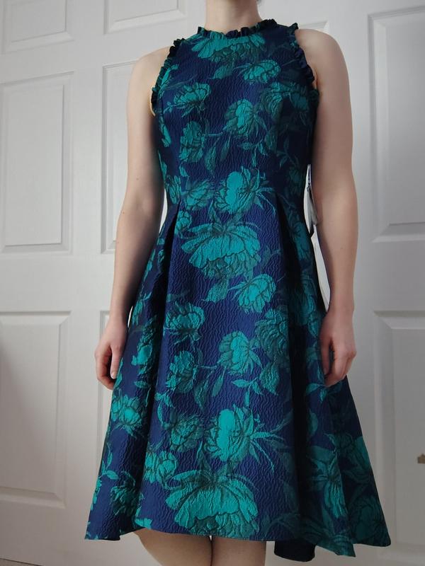 LOVED the pattern and colors on this dress. The bright teal goes so well with the navy (it's a much richer teal than all the pictures, very pretty irl). Unfortunately, the top fit a little too loose on my size 4 and they were out of the smaller size, so I has to return it. Would size down if you're in between a 2-4 like I am. I hope the brand continues this kind of style and pattern/rich color scheme in the future.