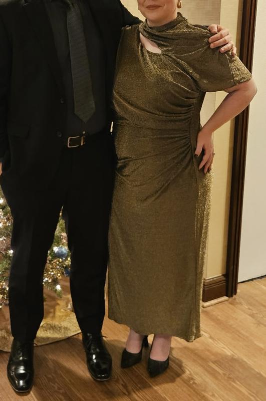 I really like this dress. It’s very comfortable, flattering, and I got several compliments on it at a black tie optional wedding I wore it to. It hits right at the ankle on me, so I didn’t have to worry about tripping me or anyone else, and the subtle chest cut out and cape effect are sophisticated details. The fabric isn’t what I would consider luxe, but that didn’t bother me so much. I hope I get an opportunity to wear it again!