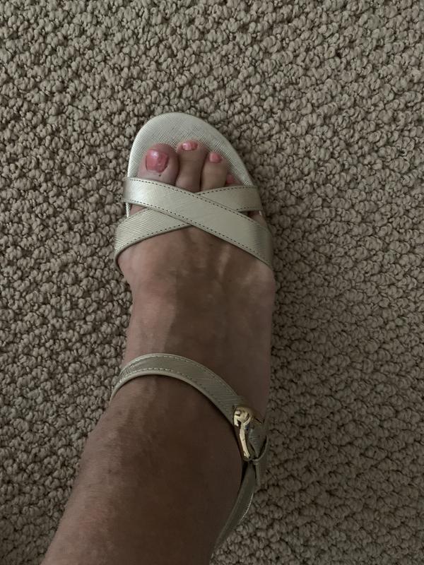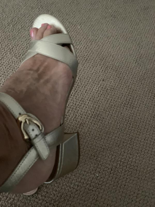 These will replace my Cole Haan's in a similar style from several years ago, which I just loved but have worn out now. They are a very similar style, but with slightly thinner cross straps. Though they are not leather, they are comfortable, true to size, and well fitting even over my bunions. Don't look cheap. The buckle seems durable and fits easily eon hole 3 around my slim to medium sized ankles. The heel is gold, chunky, where my others were a wooden wedge, but the height is right at 2 " and they have a comfortable foam insole. Cute shoe. Versatile. Good value.