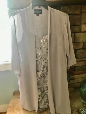 An elongated illusion jacket adds soft style and coverage to an embroidered sheath dress with this plus size set from Alex Evenings.