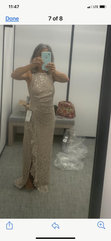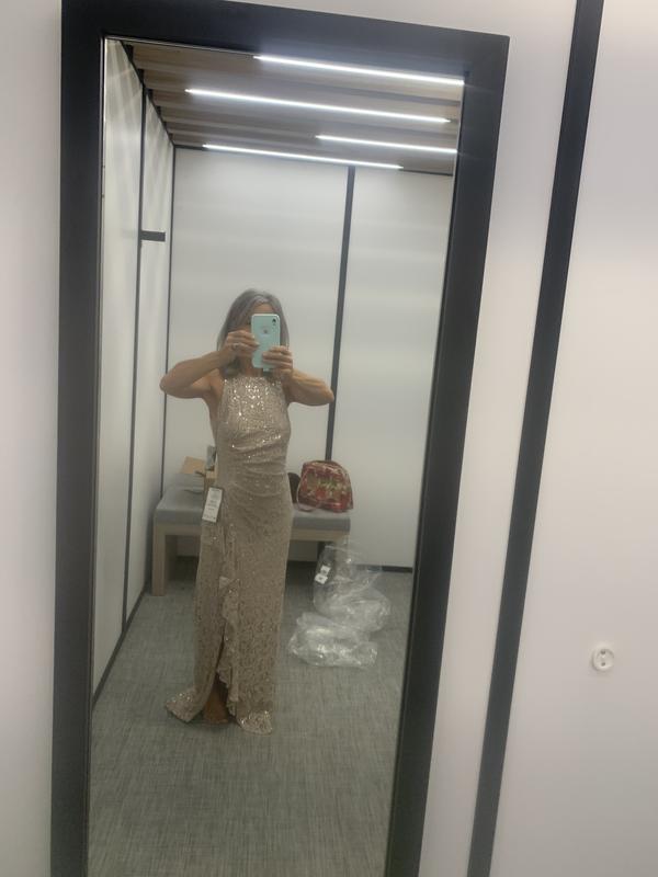 Love this dress. Very flattering and hides imperfections! The ruffle and slit are great for dancing. Great sparkle foe black tie event!