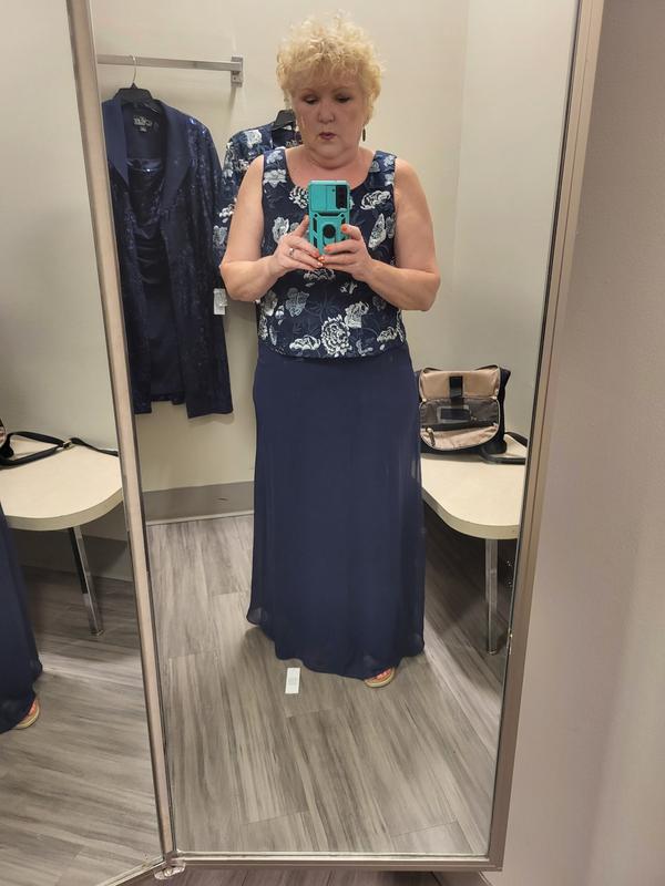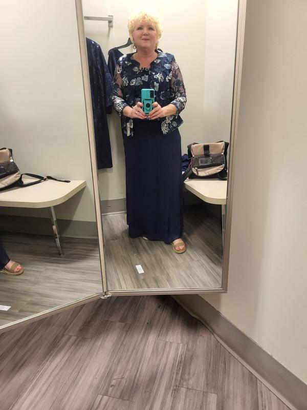 Beautiful dress. Beautiful blue color mixture. This brand never fails to perform. Their designers know how to manage material and create patterns that fit and flatter everyone's figure. Alex Evenings are not inexpensive but well worth the price you pay in order to look great.