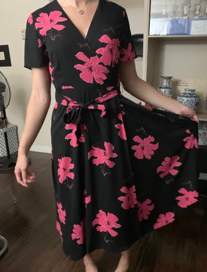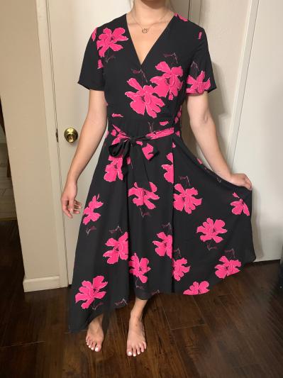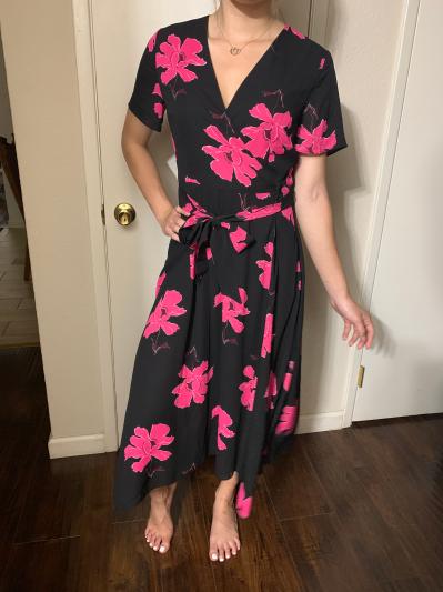 The print on this dress is so pretty. It’s very well made and I love the clasps for the wrap around rather than just ties, makes it stay together much better than a traditional wrap around dress. The only issue I have is it runs small and if you’re a little bigger on top the girls don’t fit well.