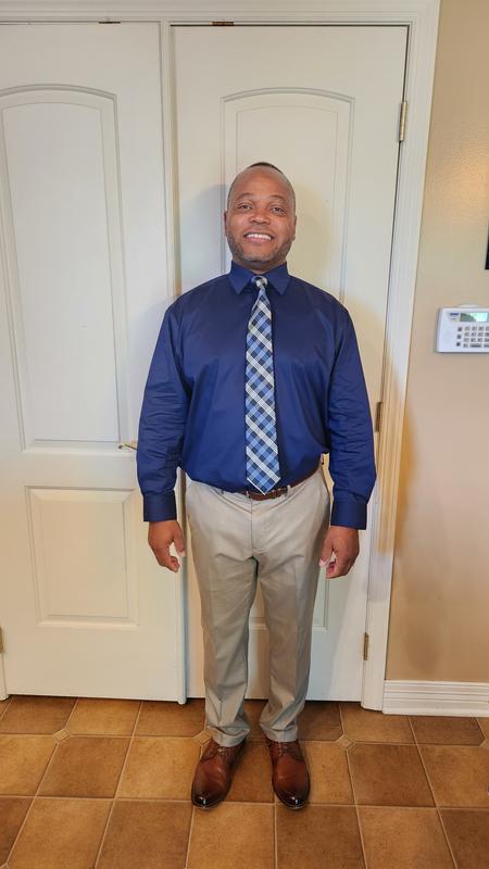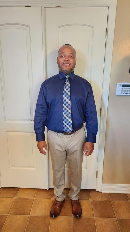 My husband wore this with a navy suit for our daughter’s wedding. My dress was “iced sage green”. Although the color of this shirt calls it a blue, it fell more into a light green shade that matched my dress wonderfully.
