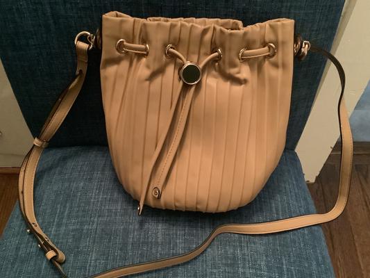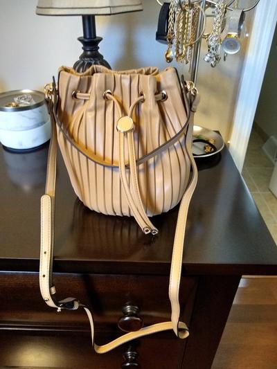 The bag is very stylish. Pros : It is a great size small handbag; the style is very nice; Has both a short and long strap. Cons: It is more off white then pictured; Neither the long or short straps detach; The long strap has to be tucked into the bag which is awarkward and takes up too much room in a small bag; The round metal piece is a bit too heavy and slides down in front; The factory wasn't careful, there were marks I had to work on to remove from the long strap and the front metal piece had marks on it; Also no storage bag provided.