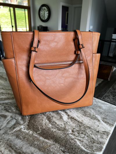 This alfani teklah tote is a very nice size . It has a very large zipper storage on one side and 2 large pockets on the other side inside the purse . The pockets are perfect for your phone or calculator, pens . The tote also has 2 large pockets on the outer side . Perfect for your phone or water bottles. The tote has plenty of room for my laptop, work files and notebooks . The tote also works well for using as my purse and when shopping able to carry my packages in .it also has nice foot taps on the bottom. However with the great things this tote offers I do not like the red and blue strip down the front . I also do not like pleather . I do not see this tote lasting long for my work use as it feels to heavy and pulls down with my small laptop and few files in it . Also I feel that the longer strap could be a little longer .