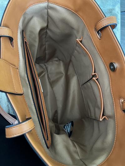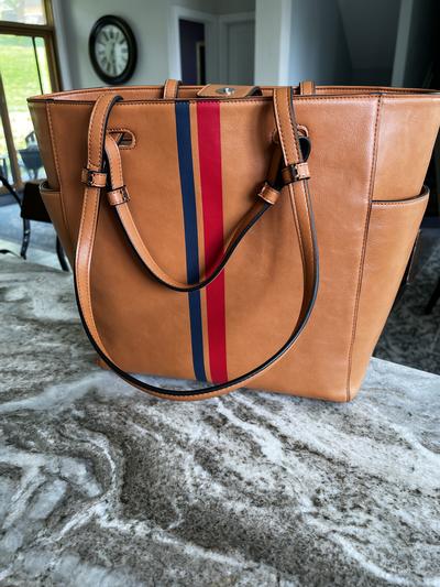 This bag is absolutely beautiful. I ordered online and picked up at my local Macy's store. When I pulled the bag out, I was struck by how nice the colors coordinated. It looks and feels luxuriously (buttery) soft to be faux leather. It has plenty of room inside and the side pockets are a plus. The only reason I gave it 4 stars instead of 5 were the two braided handles on each side. Wasn't sure what they are for and are a little distracting. The bag would have looked just as nice without the additional handles. I guess you could use the two braided handles to make a top handle bag, but the long shoulder traps are not removable, so you basically have 4 straps. Not a deal breaker for me, but they are not functional . Will use as my spring and summer tote bag instead of my usual black. Got it a great price on flash sale, so very pleased. I ordered two bags during the flash sale, one from Alfani and the other Gianni Bernini. I will be keeping this one from Alfani!