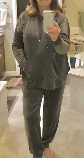 Love Alfani lounge and sleepwear products. Bought this outfit for lounging around the house. Love the color. Fabric is so soft and will probably be warm in cool/cold weather. Bought a size larger than I normally wear and am so glad. Yes, it is full and loose, but that's perfect for lounging. Sale price was extraordinary.