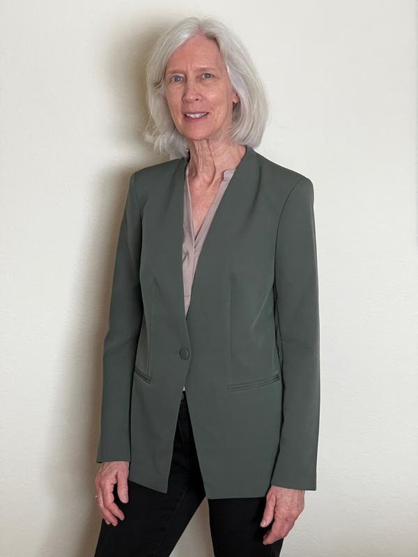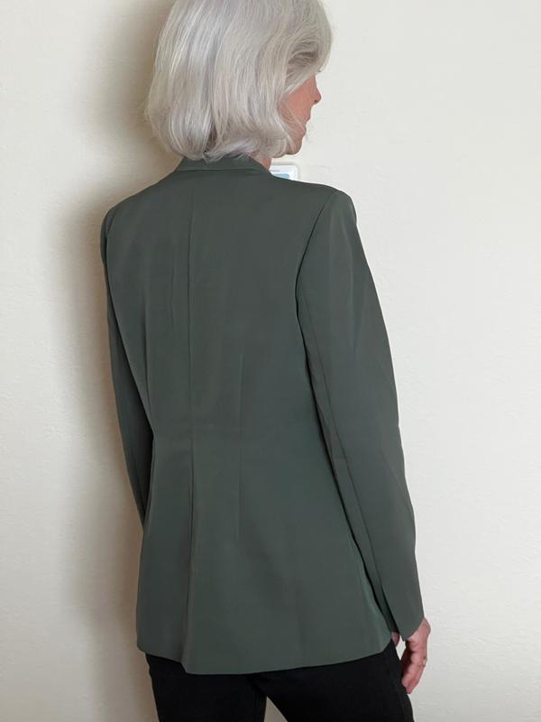 Cute blazer with a lot of style. It’s collarless so it makes it look very in style. The color is a little darker than sage green but I like it to wear with dresses and jeans. I feel like it can be dressed up or dressed down with the right outfit. I would recommend this blazer to a friend for spring into fall.