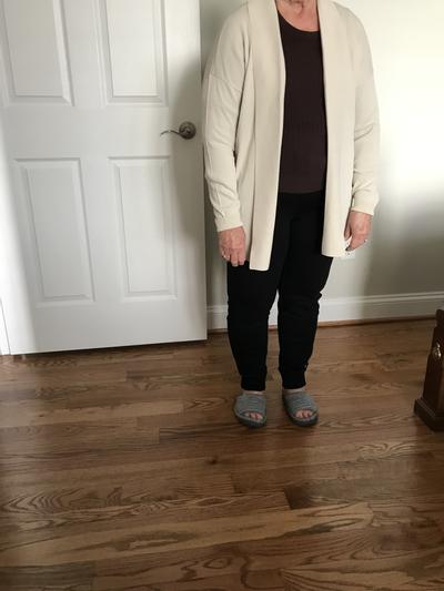 I have this in black. I wore it with a white tee and black and white checked ankle pants. So comfy and looked great.