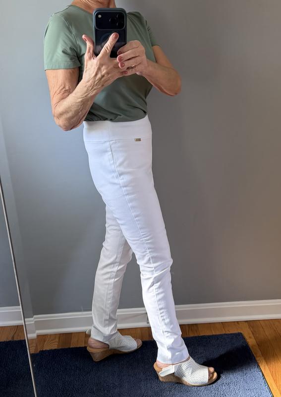 Been wearing this brand for years. 3 fabric options from casual to dressy. Waist not too high, give w/o wrinkles. Nice fit w/those who have slim thighs w/o the extra material for sleek look.