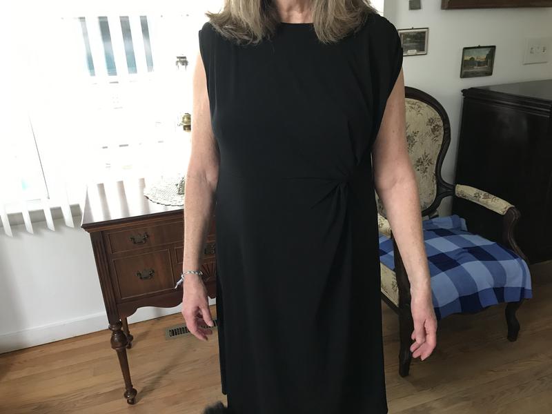 I loved this dress. I was looking for a simple black dress for a funeral and came across this one. Very flattering and sleek. The material drapes well and is very forgiving and stretchy so it fits beautifully. I will be comfortable sitting or standing. I bought this in an XL and still has room to move.