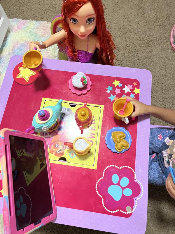 I’m so impressed by this cute tea set! It came with an interactive tea pot (more on that later), two pastries, two tiny spoons, teacups, a creamer and sugar jar. My 2 and 4 yr old daughters absolutely loved this set and turn this into their pre sleep pretend play time. On the first several nights it was a pain to convince them to leave the tea party set to go to sleep. It then became a set they had to take to bed with them so they can have “tea” as soon as they woke up as well. The quality of the toys is great and is not flimsy. I do with the rest of the items could be interactive as well but unfortunately only the teapot was interactive. Press on the circular top and images interchangeable. Three different pictures rotate with each press. I do wish that the sugar container and creamer container could be opened or somehow be made interatxruve as well because that was a cause of concern for my kiddos who desperately tried figuring out how to open them or see what they can do. Overall I’d definitely recommend despite its shortcomings.