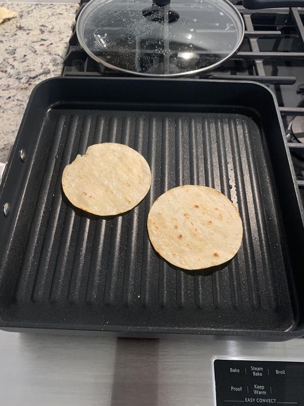 This is the perfect grill pan. Food cooks evenly, releases completely and cleans up is a breeze. Great value.